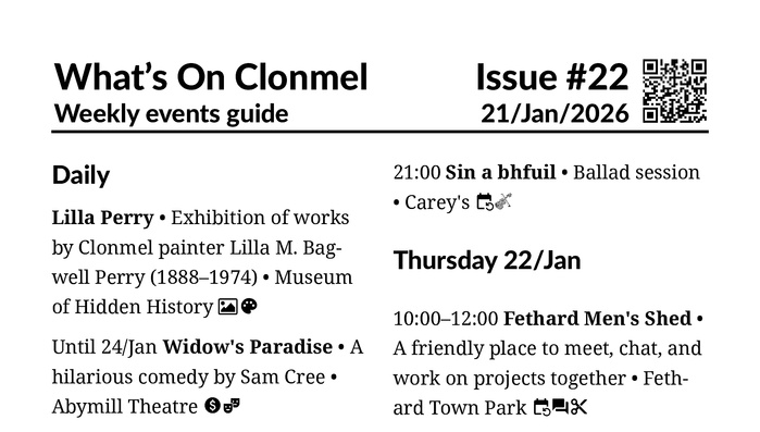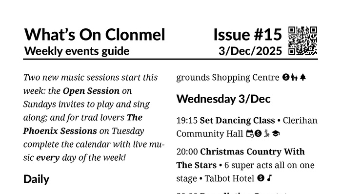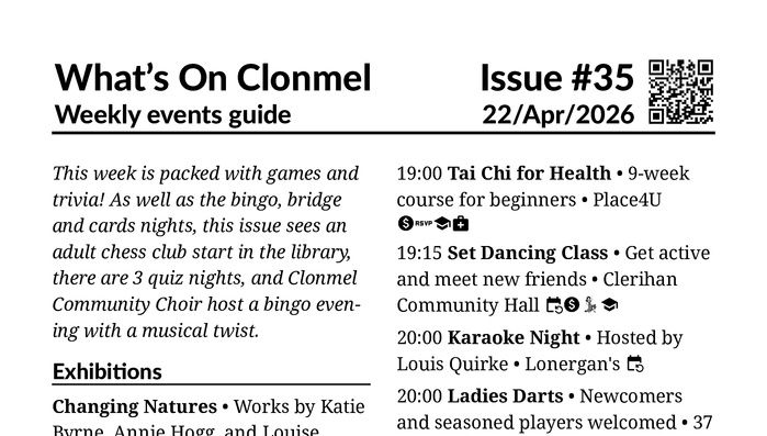 Welcome to the online version of What’s On Clonmel, your weekly guide to events and entertainment.