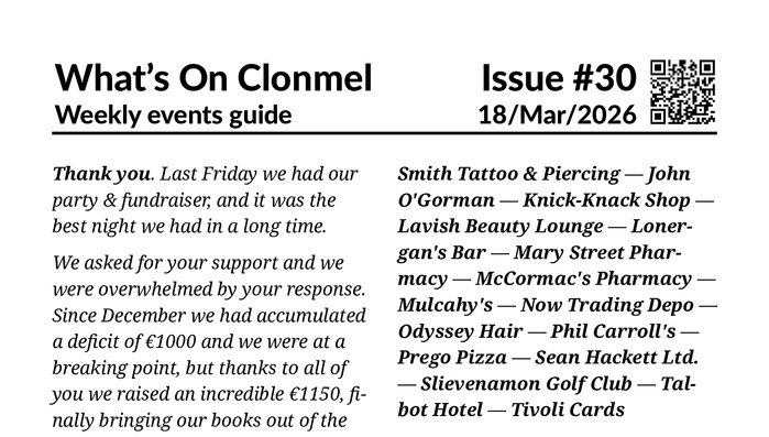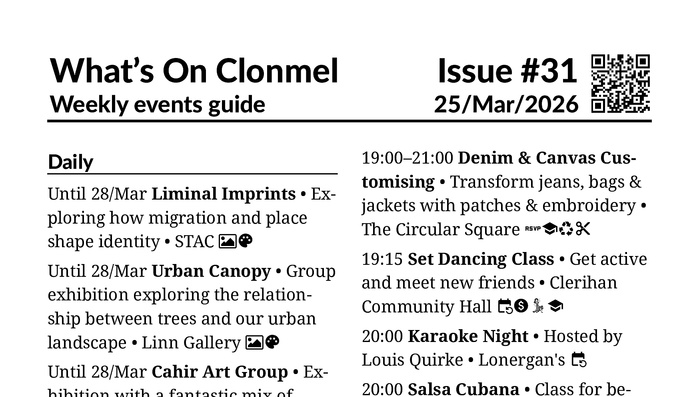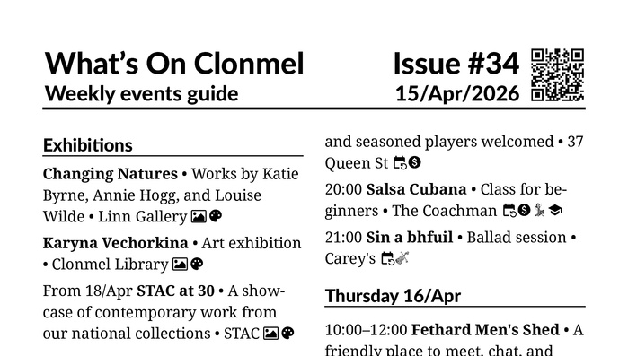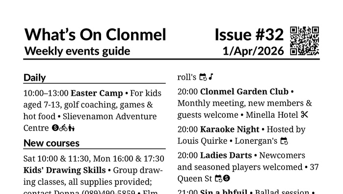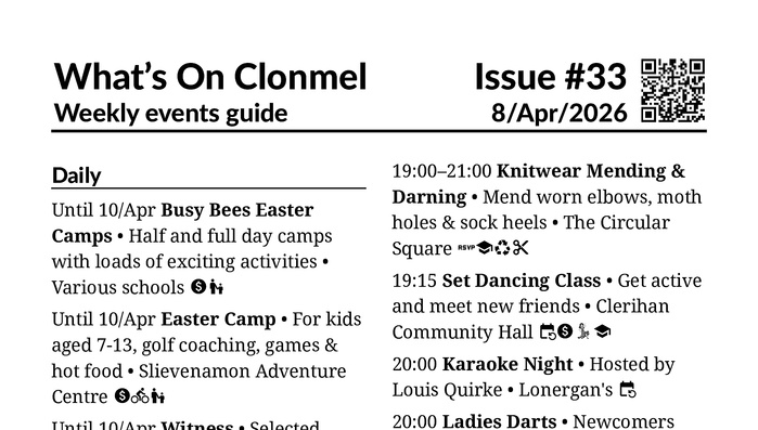This week is packed with games and trivia! As well as the bingo, bridge and cards nights, this issue sees an adult chess club start in the library, there are 3 quiz nights, and Clonmel Community Choir host a bingo evening with a musical twist.
